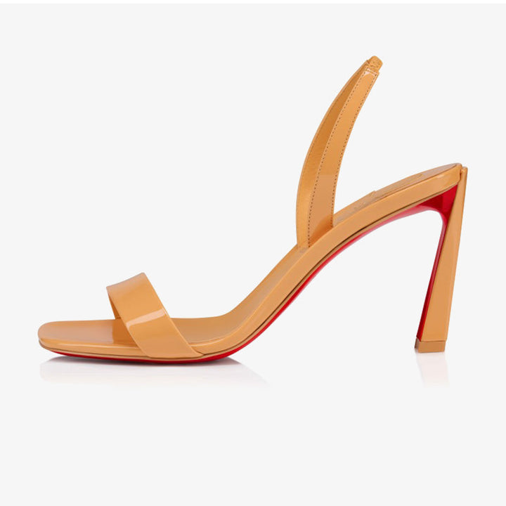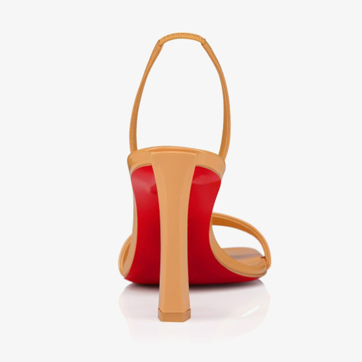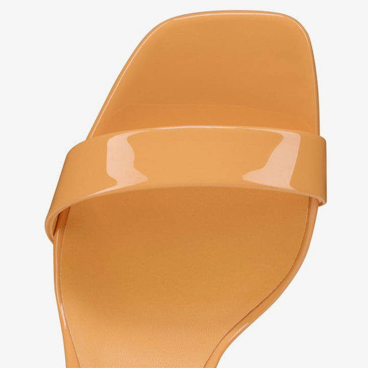 This sophisticated sandal stands out with its square open toe and is mounted on an 100mm wedge heel for added comfort and style. Crafted entirely from Giraffe orange patent calfskin, it features a thin upper and a strap that delicately adorns the top of the foot, making it the perfect blend of elegance and modern design.