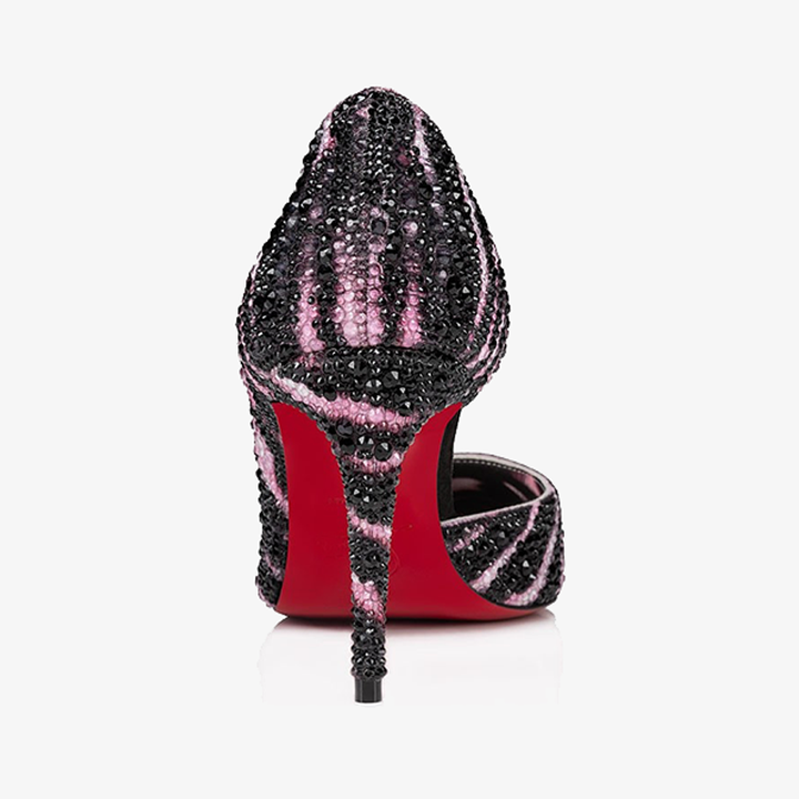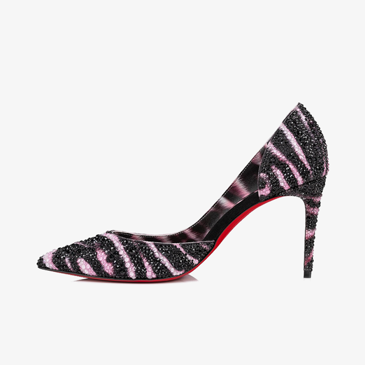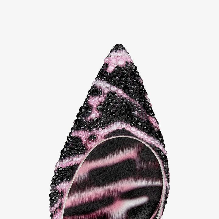 This elegant stiletto features a modern pointed toe and a towering 80mm heel, creating a beautiful arch that enhances the foot. Crafted in an exotic glam purple and black velvet with an animal print design, it is adorned with a myriad of sparkling details. A versatile pump that effortlessly elevates any occasion.