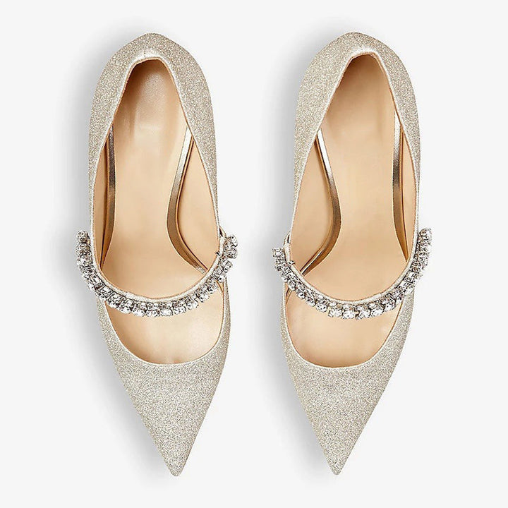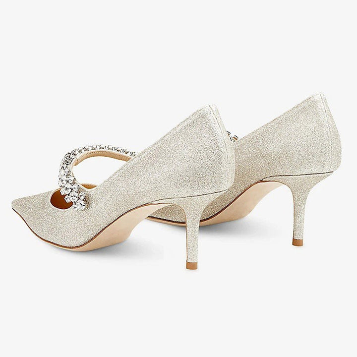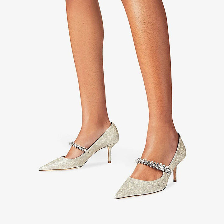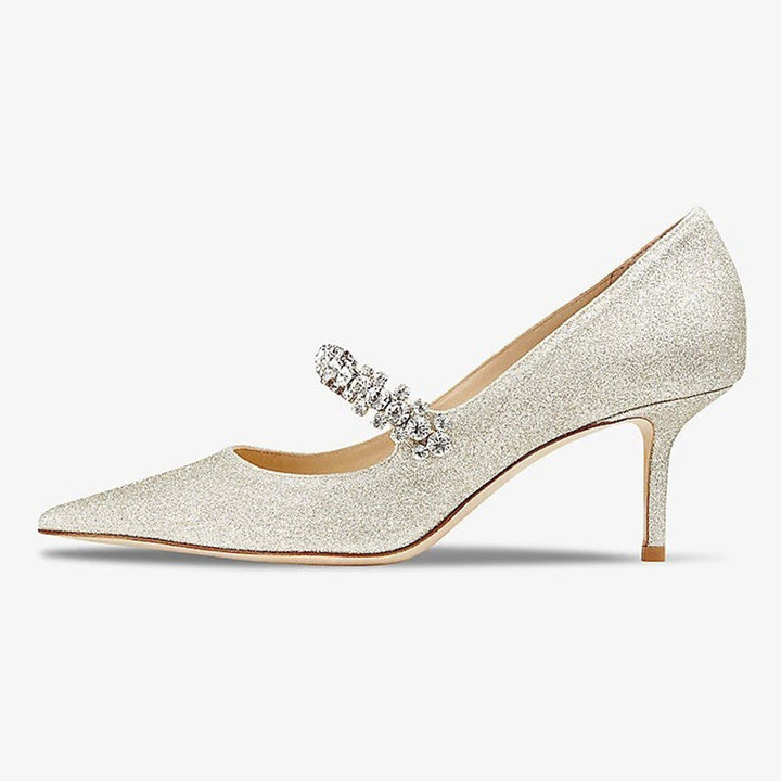 These backless mules feature a pointed toe, crystal-embellished strap, and 65mm stiletto heel. Crafted entirely from leather with a slip-on design, they blend elegance with ease. Professional leather care recommended.