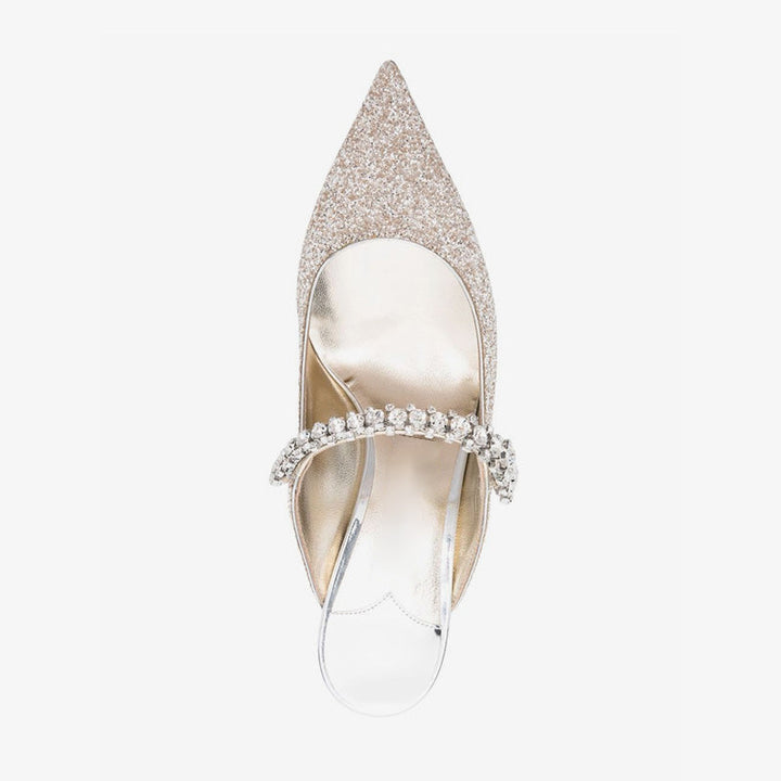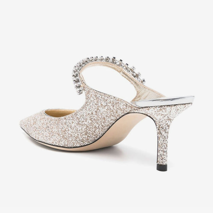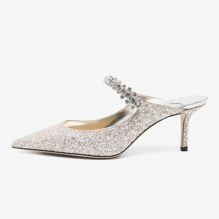 Elegant and eye-catching, these silver mules feature a pointed toe, crystal detailing, and a comfortable 65mm heel. Finished with a leather sole and soft lining, they add a refined touch to any look.