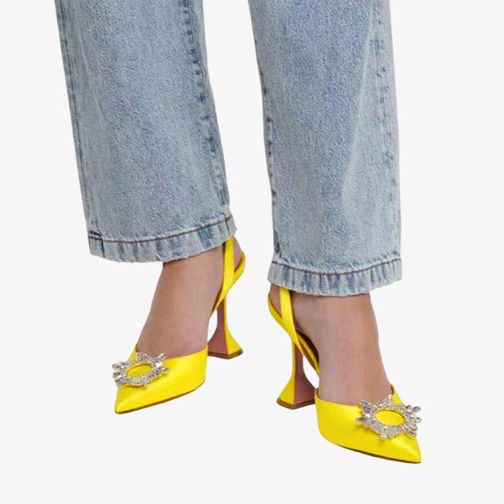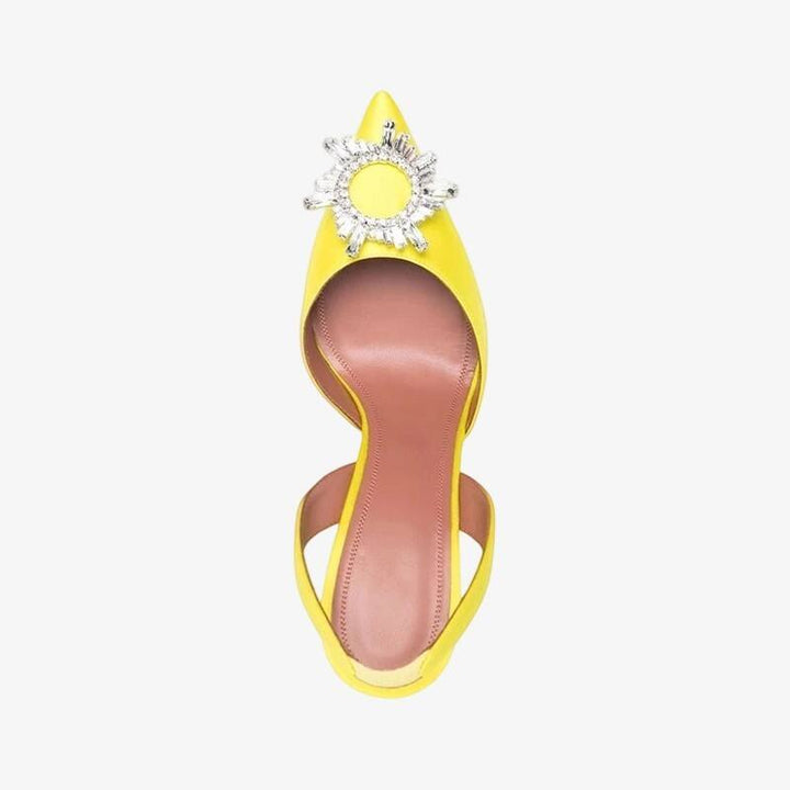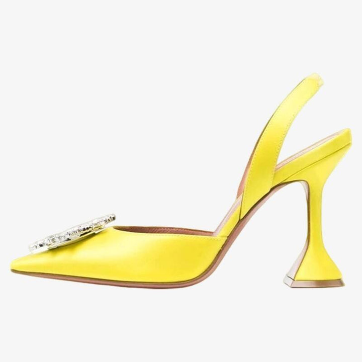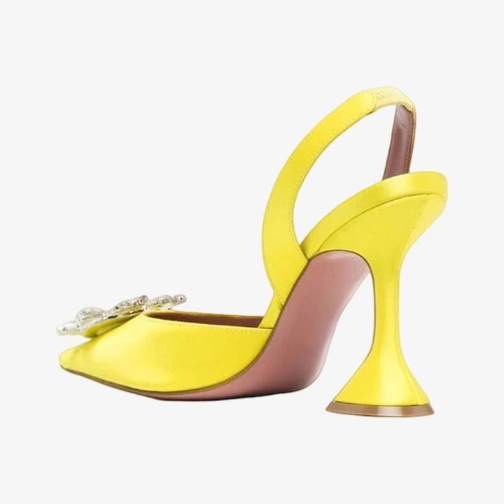 Make a radiant statement in these vibrant yellow satin pumps, featuring dazzling crystal embellishments and a sleek pointed toe. The slingback strap ensures a secure fit, while the 95mm heel adds elegant height with timeless sophistication.