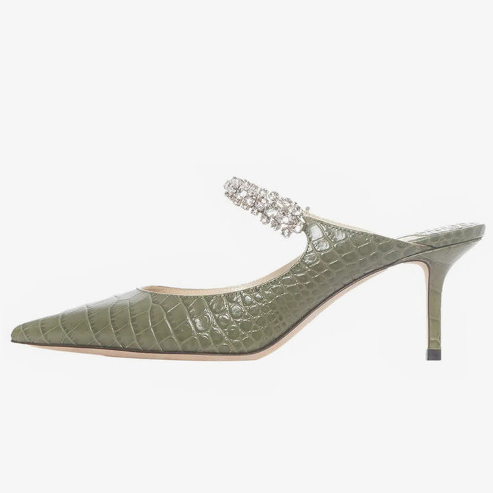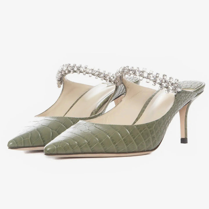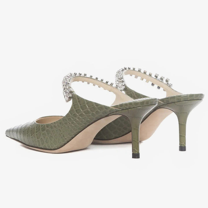 These green leather high heels feature a croc-embossed texture and a pointed toe. A crystal-embellished strap adds a touch of elegance to the sleek design.
