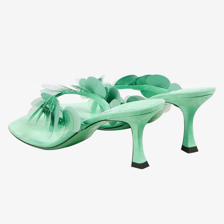 These green suede sandals feature wide curved vamps adorned with a mix of opaque and translucent sequins. Designed with squared soles and fluted 70mm heels, they offer a comfortable slip-on fit with standout style. Color:green