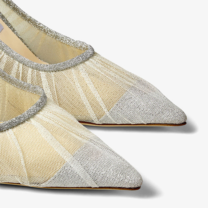 These dazzling heels feature a shimmering metallic silver fabric with an ivory tulle overlay, creating a high-octane, glamorous vibe. Designed with a dramatic pointed toe and leather lining, they offer both style and comfort, making them the ultimate statement piece for any special occasion.The heel height of this pair is 100mm.