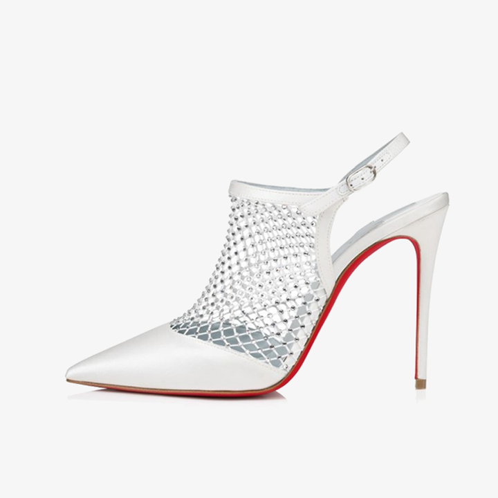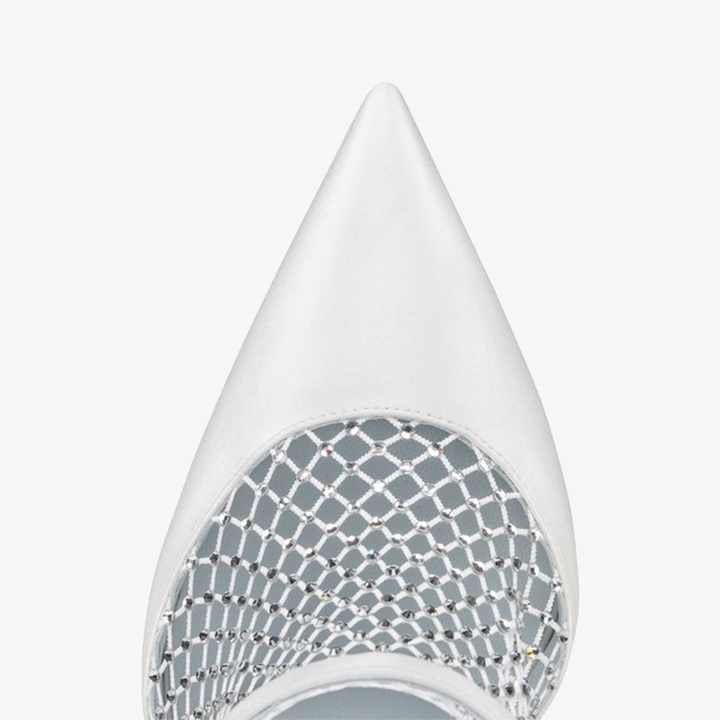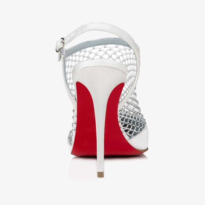This elegant pump sandal features a unique fishnet upper, inspired by fishing nets, and is crafted in luxurious ivory crepe satin—ideal for weddings. The satin material adorns the foot and heel straps, wrapping the footbed and 100 mm stiletto heel. With an almond toe box and wide sandal last, it offers both sophisticated style and comfortable wearability.