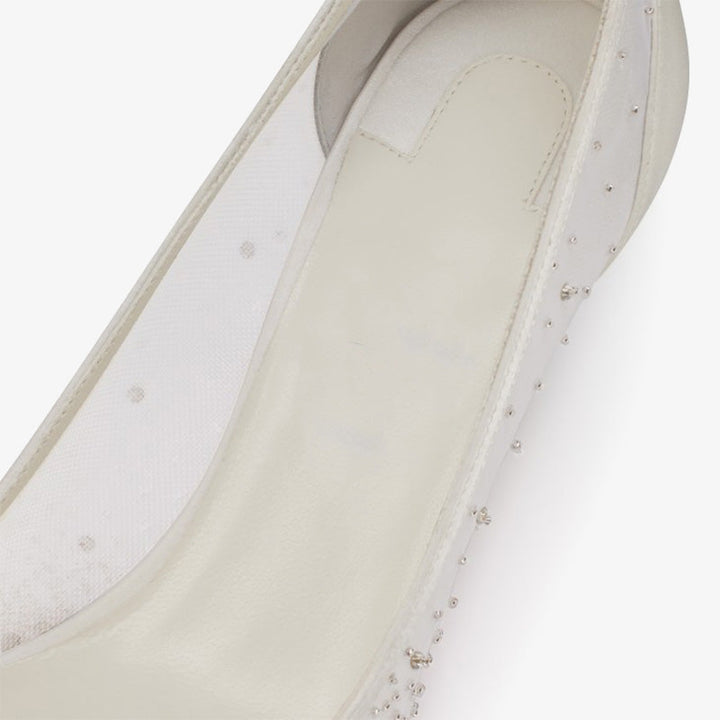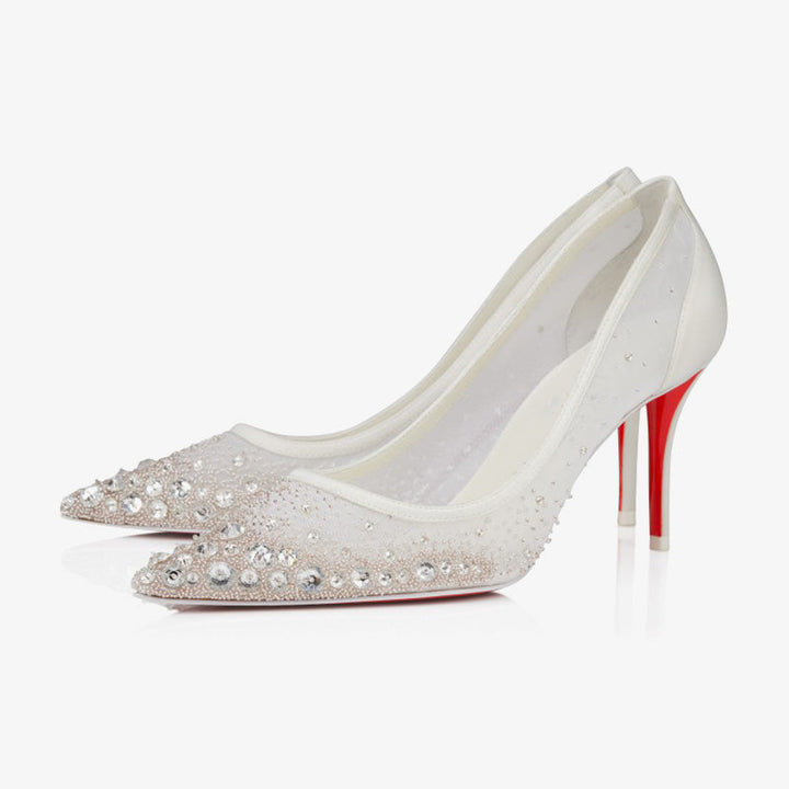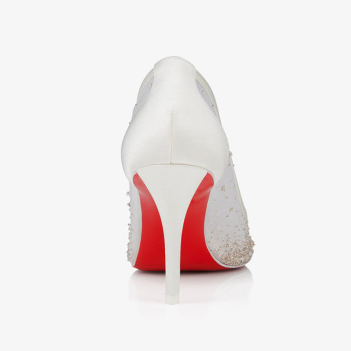 A new icon, this pump is a modern twist on a timeless silhouette. Featuring a slightly elongated pointed toe and a distinctive 80 mm stiletto heel that artfully reveals more of the signature red sole, it is crafted in delicate ivory organza and satin with a snow white lining. The toe is hand-embroidered with crystal beads and gemstones—each pair requiring 20 to 30 hours of meticulous craftsmanship. This model also debuts the innovative 'Everlasting Red' sole, ensuring enhanced durability and lasting vibrancy.