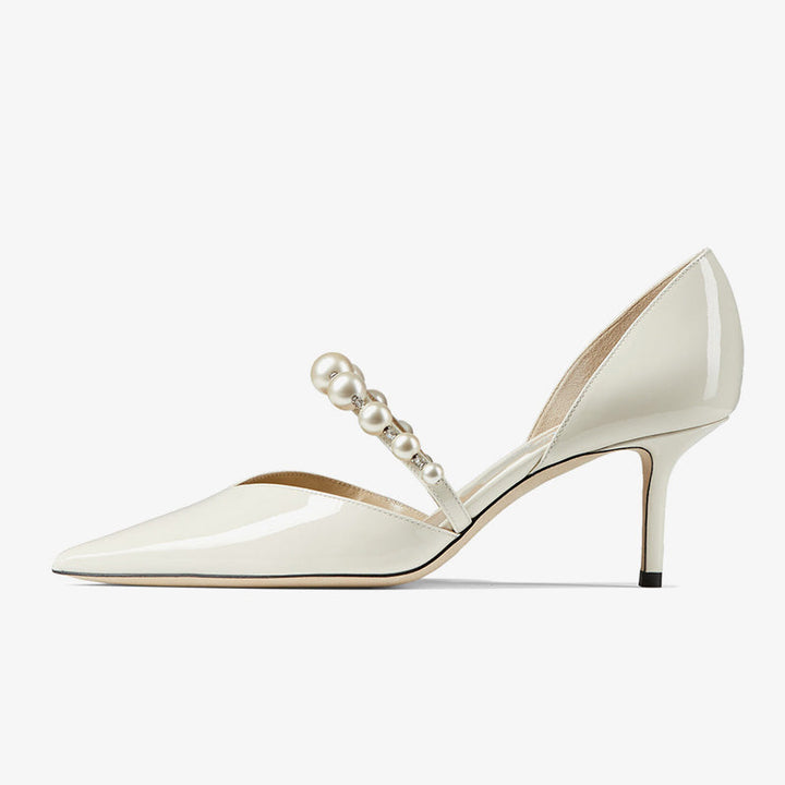 These elegant pumps are crafted from latte patent leather, featuring a pointed toe and a single strap adorned with glossy white pearls and crystals. The open sides and arch strap add a modern touch, making them a versatile choice for effortless sophistication from day to night.The heel height of this pair is 80mm.
