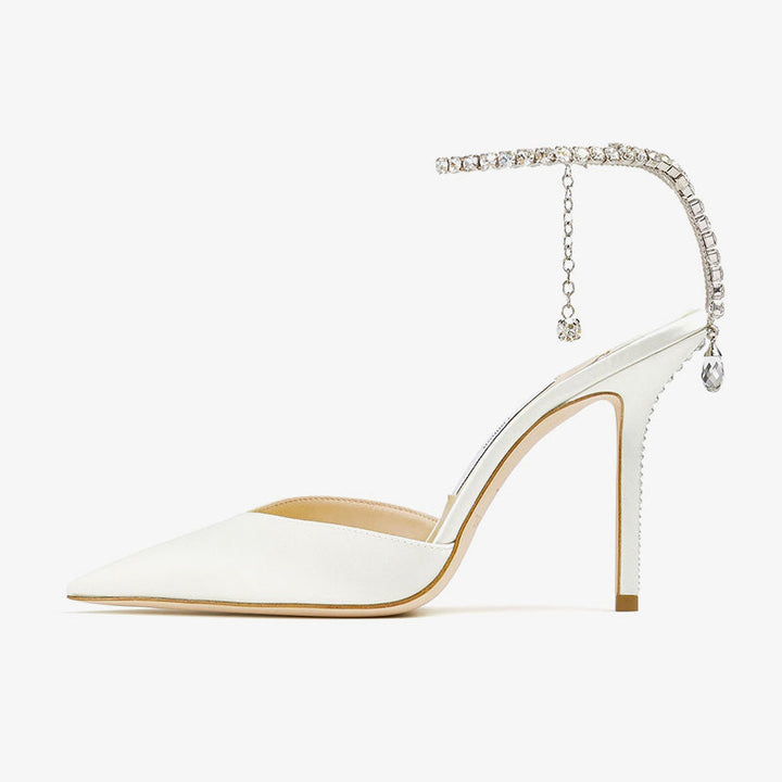 A fusion of elegance and artistry, these leather pumps redefine sophistication with a delicate crystal-adorned chain that wraps the ankle like fine jewelry. Sparkling crystals flow seamlessly along the 100mm heel, adding a touch of drama and allure. Finished with a sleek pointed toe and refined silhouette, this design embodies pure luxury—perfect for making a memorable entrance.