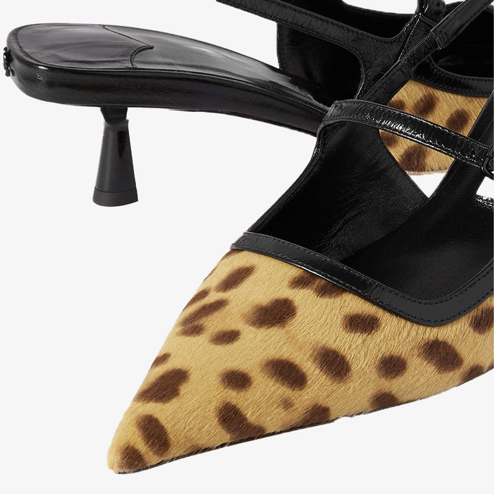 These leopard-print calf hair slingback pumps are designed for effortless style, combining pointed toes with sleek leather trim. The elasticated slingback and buckle-fastening strap ensure a comfortable fit, while the angular heels add a contemporary flair. Perfect for both tailored looks and casual denim, they offer versatile elegance for any occasion.The heel height of this pair is 30mm.
