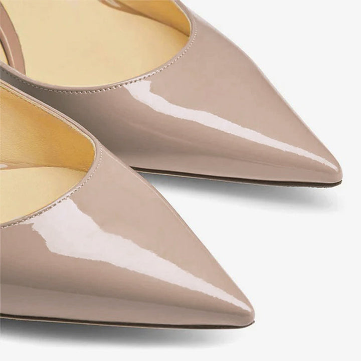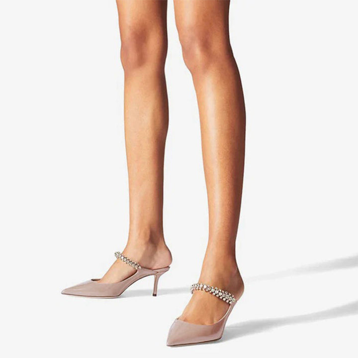 Sleek and feminine, these glossy patent leather mules feature a pointed toe and a crystal strap for a touch of glamour. Designed with a slip-on silhouette, leather lining and sole, and a 65mm heel that elongates the legs.