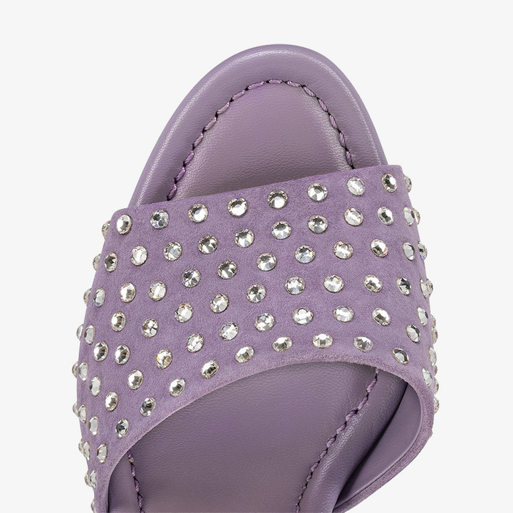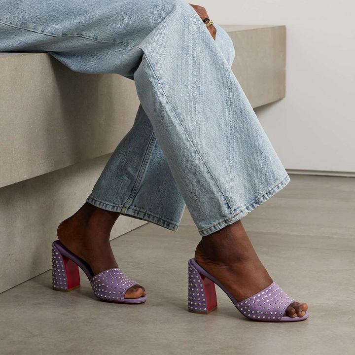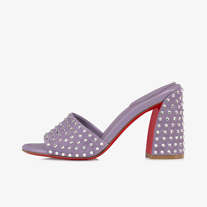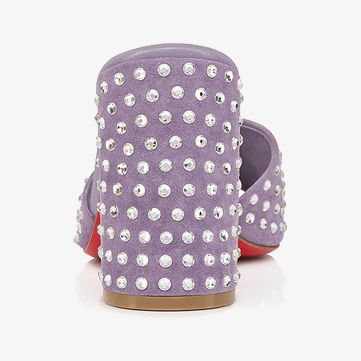 This slip-on sandal features a padded insole for comfort, an almond-shaped toe, and a distinctive 100 mm shaped heel that reveals a hidden flash of red. Crafted in all-over lilac calf leather with tonal lining, the heel and toe are adorned with evenly-spaced oversized strass for a shimmering, show-stopping finish.