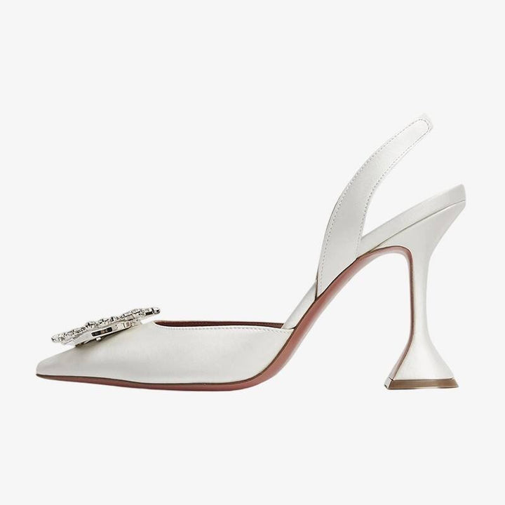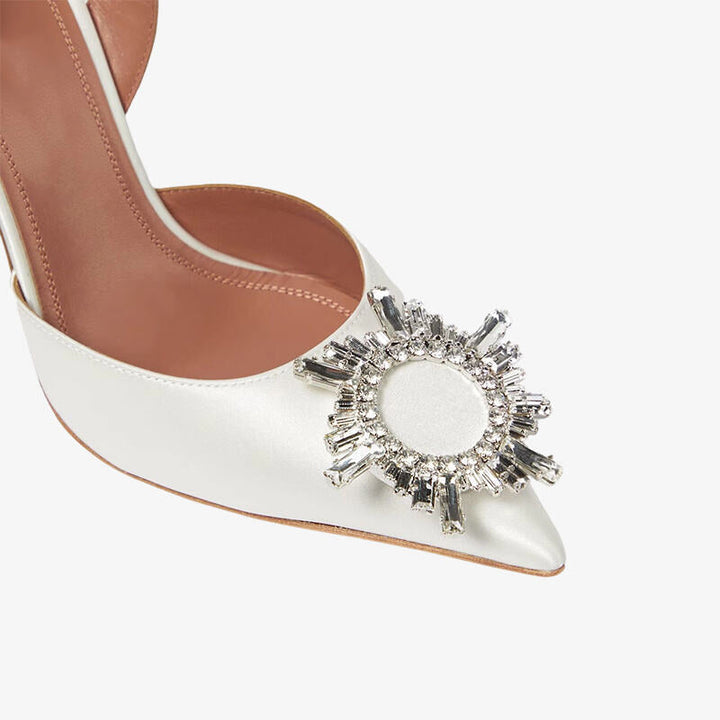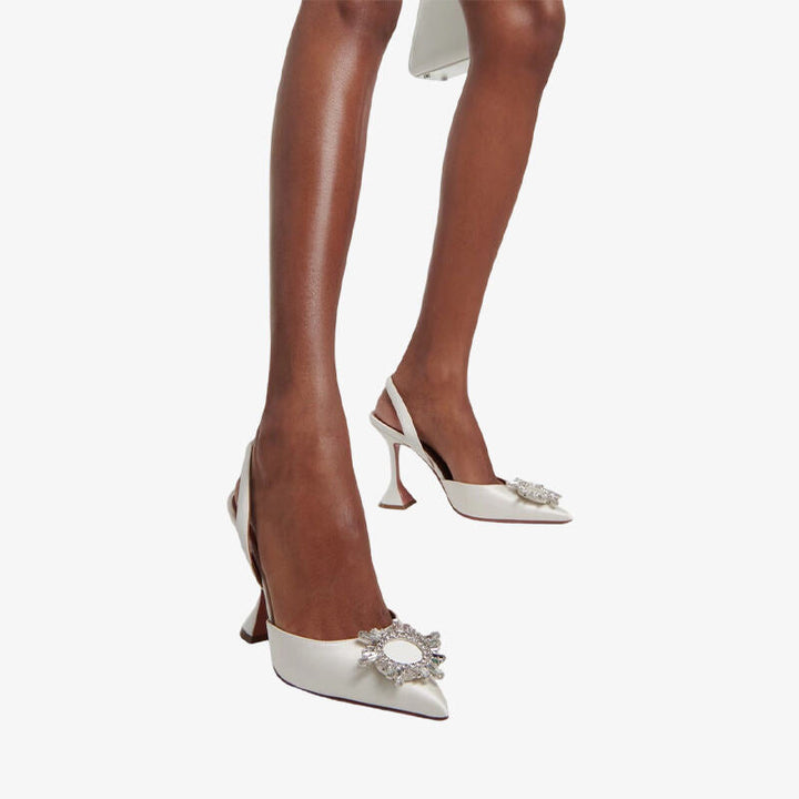 Like captured moonlight given form, these white satin slingbacks radiate ethereal elegance. The mirror-polished crystal buckle fractures light into celestial patterns, while the architectural 95mm heel lifts your silhouette with weightless grace.
