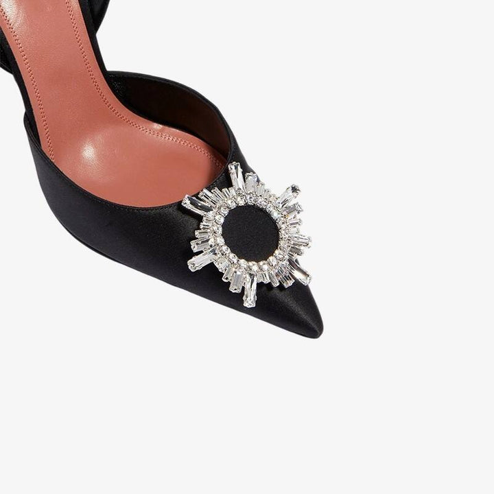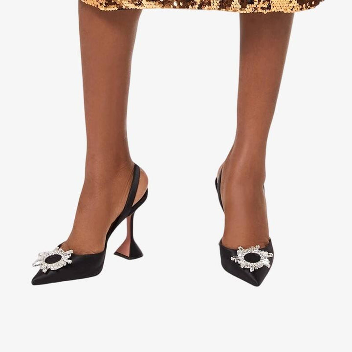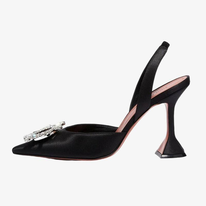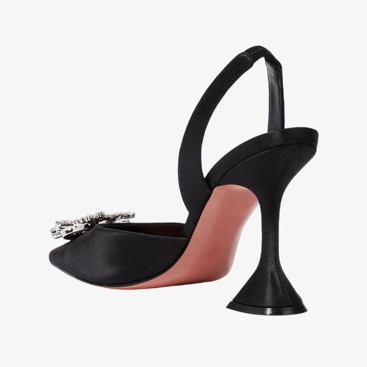 These black satin slingbacks, resembling liquid obsidian set on silk, are a captivating sight. The mirror-polished crystal buckle creates mesmerizing patterns in the light, while the 95mm architectural heel gracefully frames your figure.