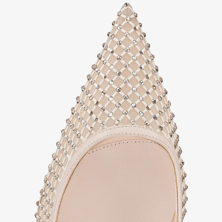 Designed with a distinctive 80 mm slanted heel, this elegant pair is crafted from lychee-toned mesh, trimmed with smooth calf leather, and adorned with hand-applied crystals. Featuring a pointed toe and a daring low-cut upper, it exudes refined modernity. The soft mesh construction ensures enhanced flexibility and comfort, making it a graceful choice for elevated occasions.