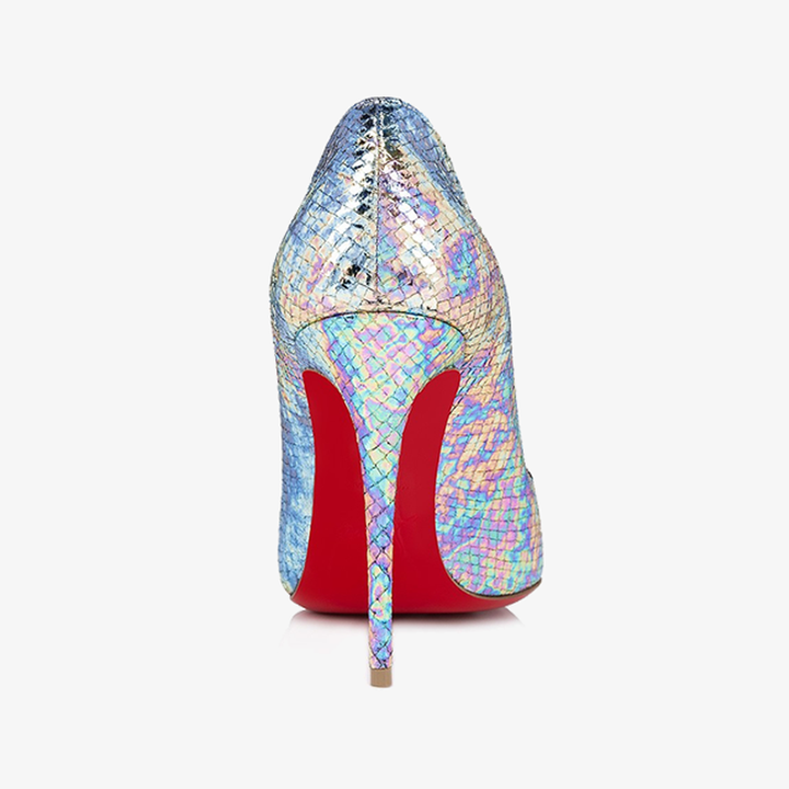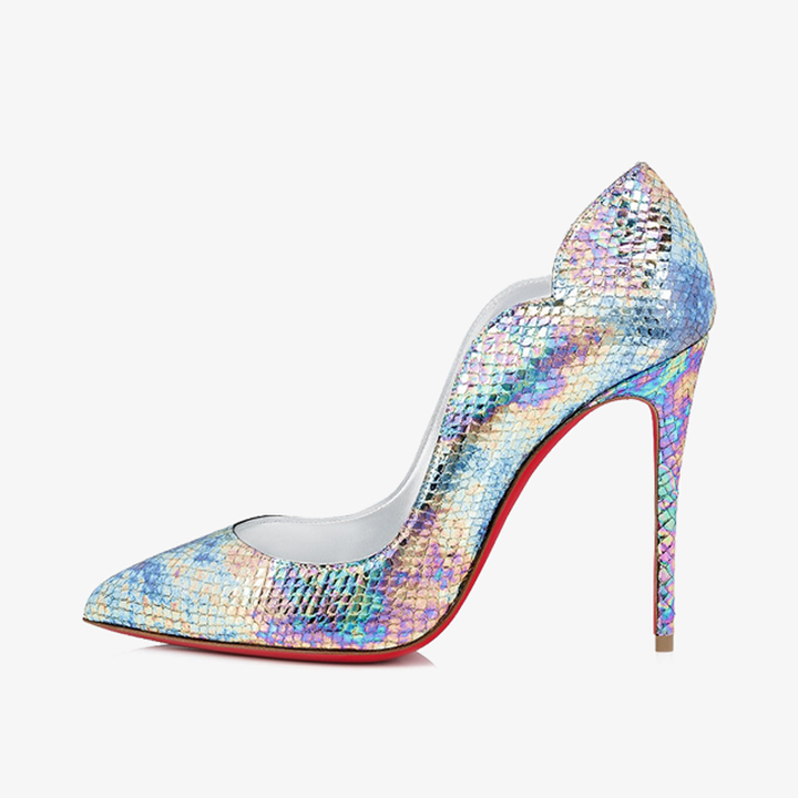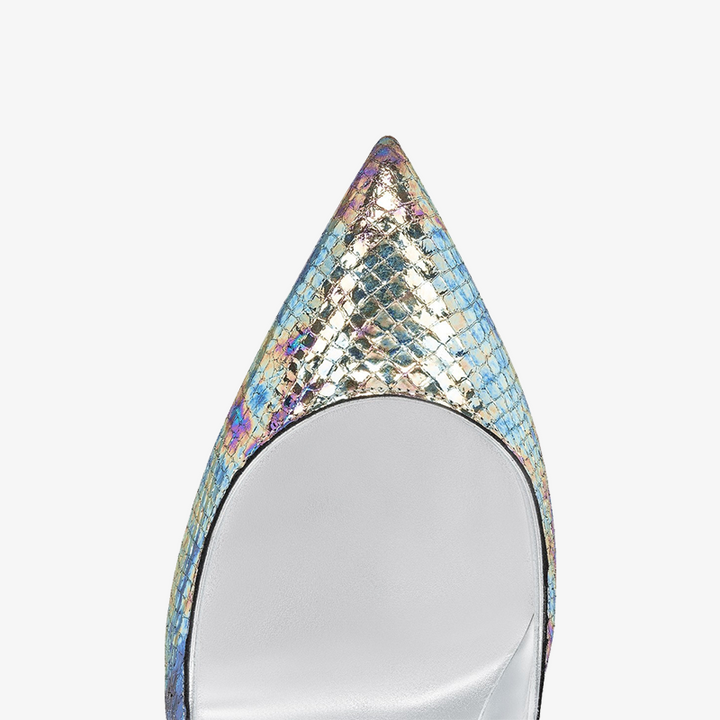 Featuring a low-cut vamp and pointed toe, this pump showcases V-shaped notches under the ankle for a sleek, modern silhouette. Set on a 100 mm heel, its striking details, including a silver insole, add a touch of sophistication. Crafted in metallic snake-effect calf leather, this design combines elegance with contemporary flair.