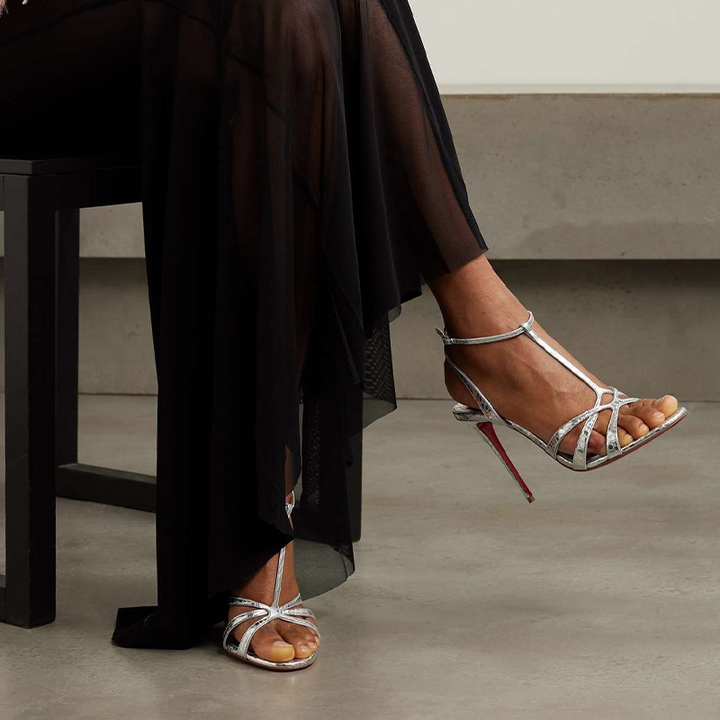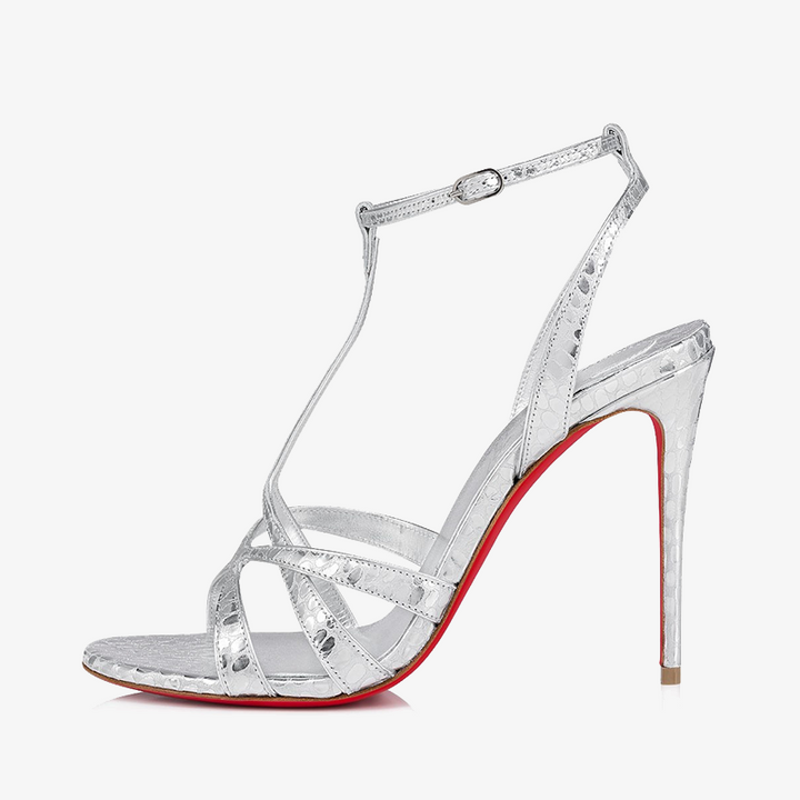 With its plunging vamp, the sandal elegantly reveals the foot. Crafted in silver calf leather with a textured scale effect, this model stands on a 100 mm heel with a small platform for added comfort. The front straps create a striking graphic effect, while a metallic clasp on the side adds a sophisticated finishing touch. Perfect for those seeking both elegance and bold style.