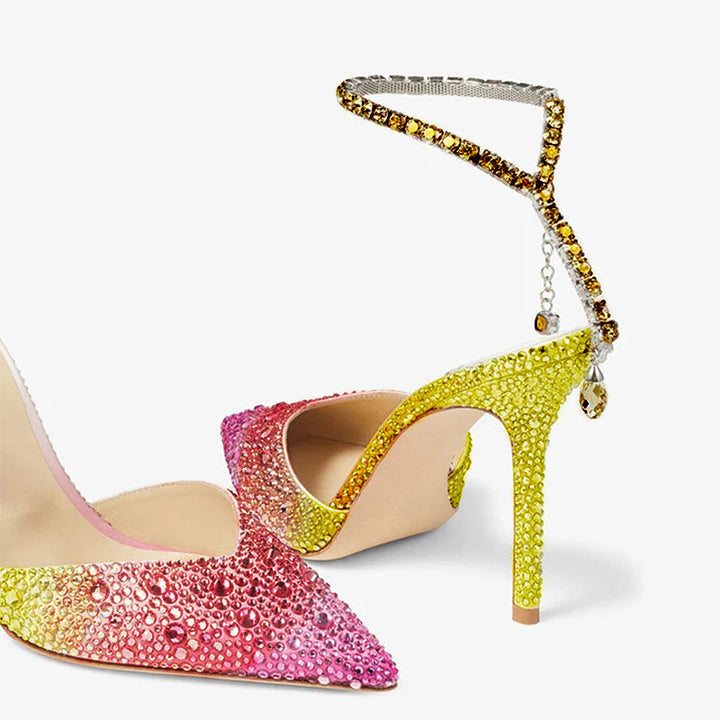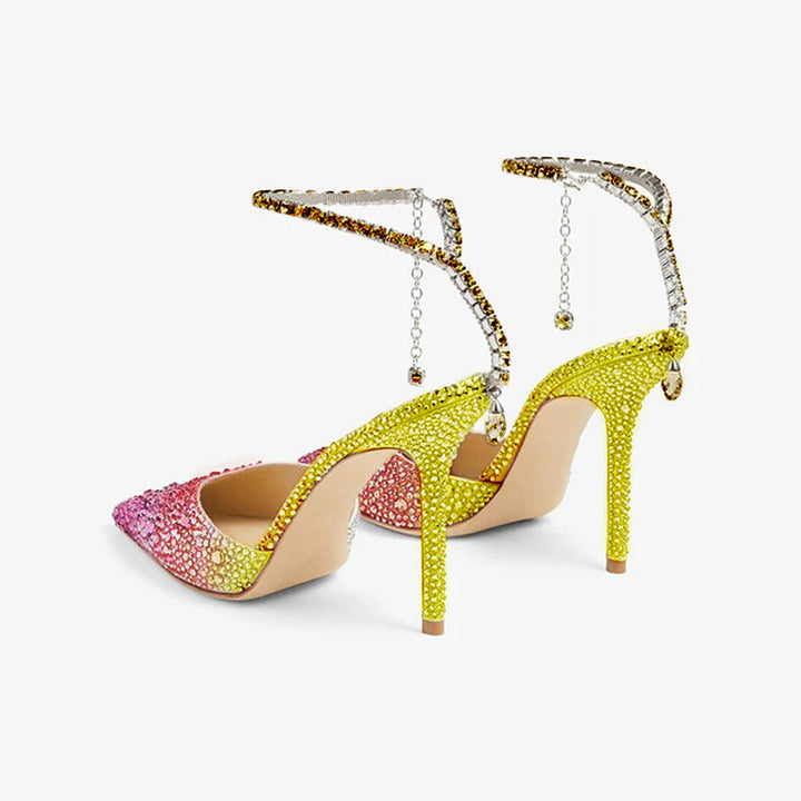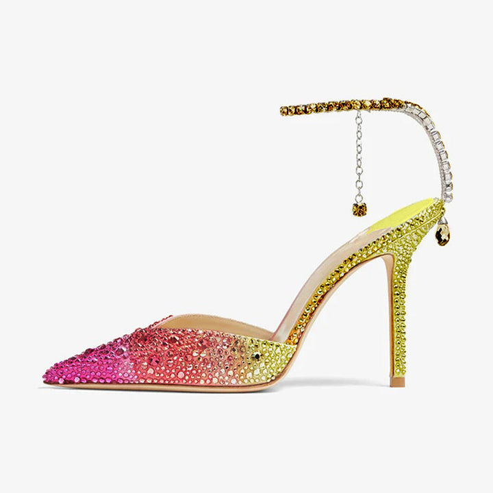 Add a pop of color and sparkle to any occasion with these eye-catching multicolor satin stilettos. Featuring a pointed toe, gradient crystal embellishments, and a delicate crystal ankle strap, these 100mm heels are designed to turn heads. Perfect for weddings, birthdays, red carpet events, or nights out when you want to shine bright and make a bold statement.