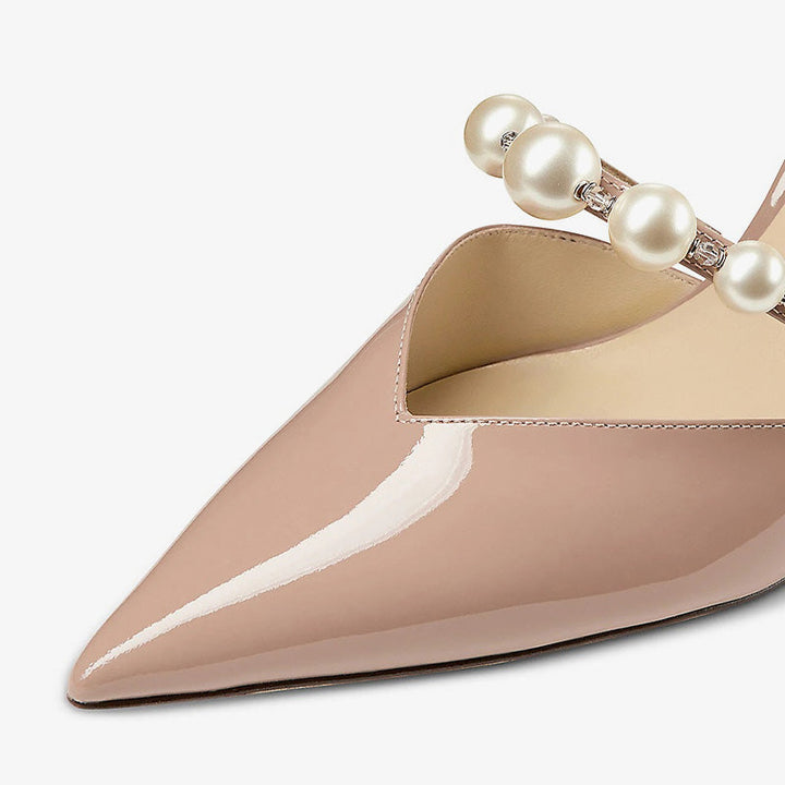 A timeless court shoe with a modern twist, crafted from glossy patent leather. Featuring an elegant pointed toe, open sides, and a delicate arch strap adorned with luminous pearls and sparkling crystals. Effortlessly chic and refined, this design is the perfect complement to both evening ensembles and sophisticated daywear.The heel height of this pair is 100mm.