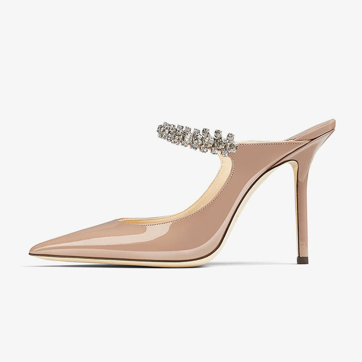 This mule in nude patent leather exudes modern elegance. Adorned with a sparkling crystal strap across the foot, it adds a touch of refined glamour. The pointed toe and slip-on design create a sleek silhouette, perfect for pairing with your favorite little black dress. Lined with luxurious leather and set on a smooth leather sole, this shoe blends sophistication with effortless style.The heel height of this pair is 100mm.
