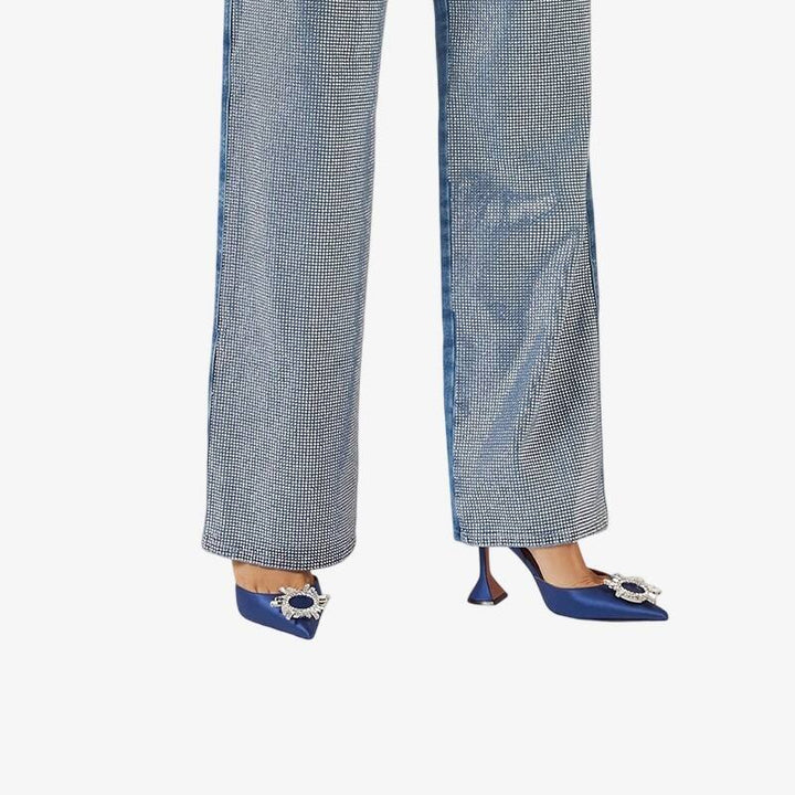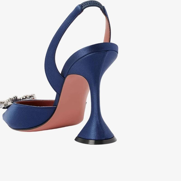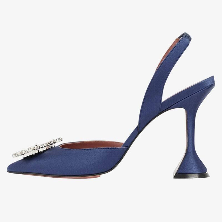 Like moonlight dancing on midnight waves, these navy satin slingbacks capture deep-sea mystery in every step. The mirror-polished crystal buckle shatters light into a thousand star-like fragments, while the architectural 95mm heel lifts your silhouette with liquid grace.