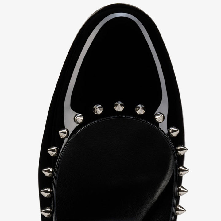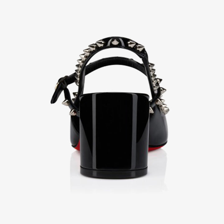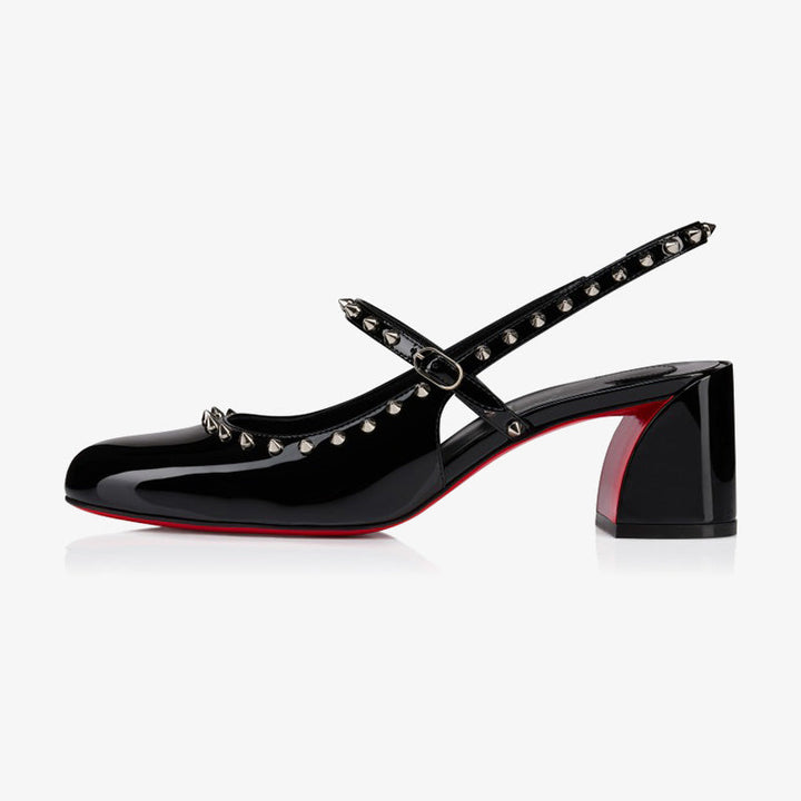 These sophisticated ballerina flats are crafted from black patent material and feature a slightly rounded toe for a refined look. A delicate strap at the back reveals the foot, while metallic spikes add a bold, edgy detail. Set on a 55mm heel, these flats combine elegance and modern flair for any occasion.