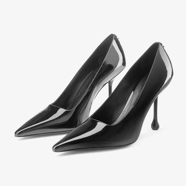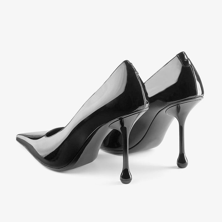 This contemporary take on the classic pump features a sleek patent leather design with a square vamp and a striking drop heel. The pointed toe and refined silhouette make it a versatile yet glamorous addition to your footwear collection, offering a modern edge with timeless elegance.The heel height of this pair is 100mm.
