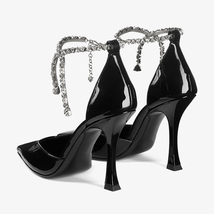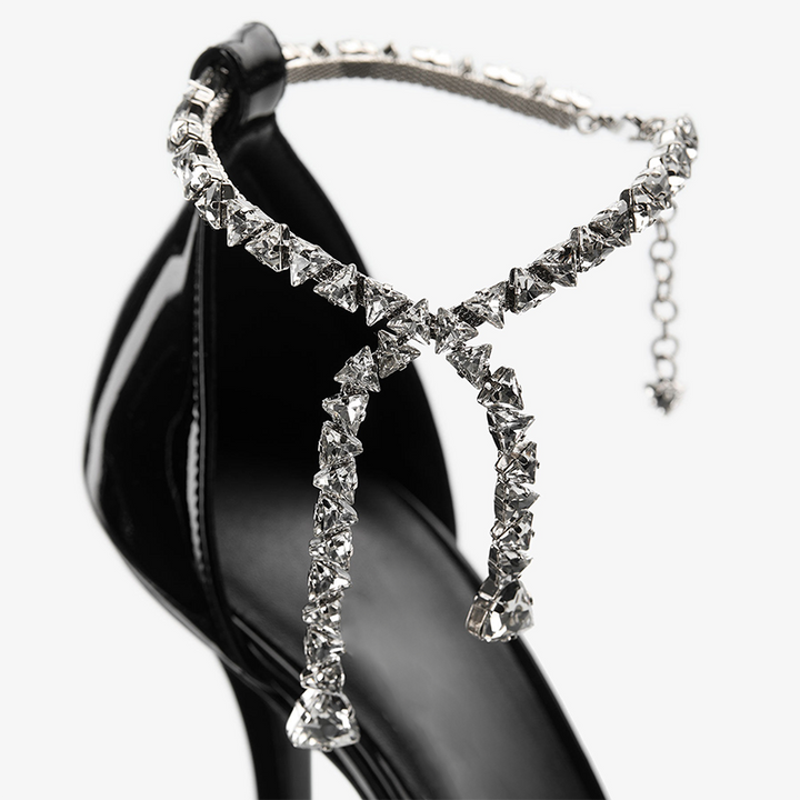 A fusion of elegance and modern allure, these patent leather pumps feature a pointed toe and a sculpted heel. The delicate crystal anklet adds a touch of glamour, securing with a sleek bracelet clasp. A statement piece designed to captivate with every step.The heel height of this pair is 100mm.