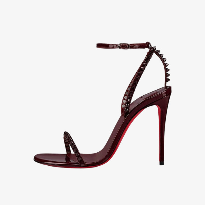 These sandals stand out with a refined silhouette, graceful arch, and subtle heel. Crafted from rich brown-red patent leather with a matching lining, they bring effortless elegance to any look.