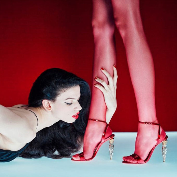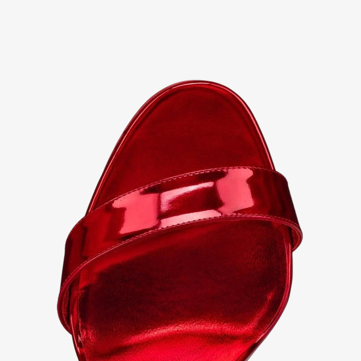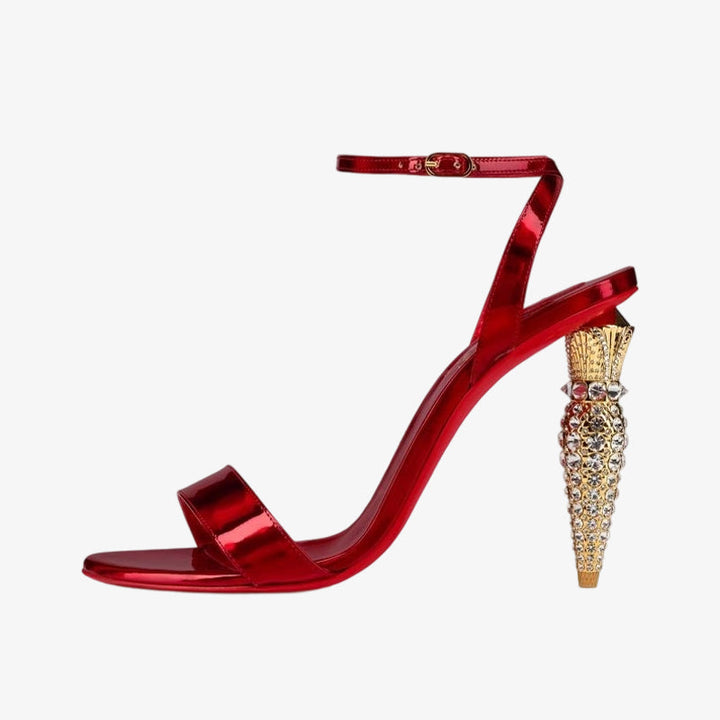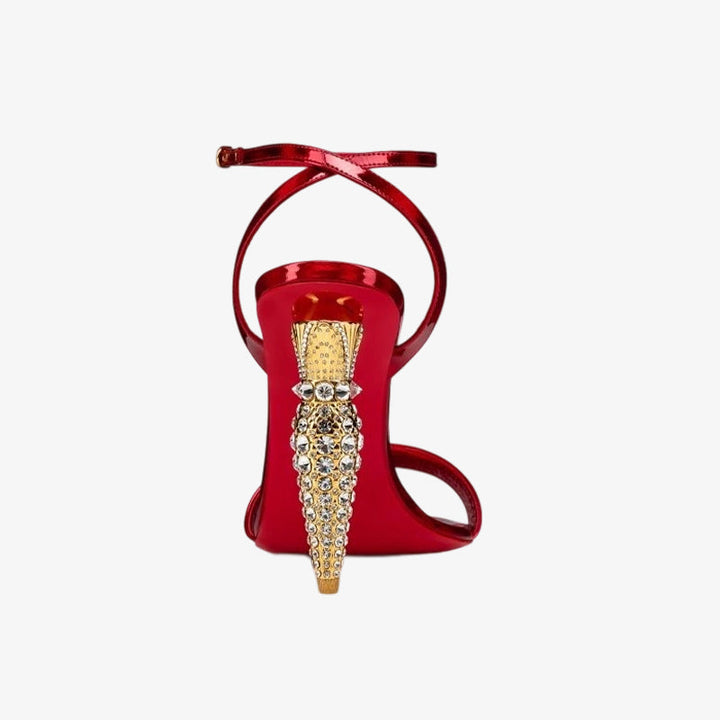 These sophisticated heels in glossy red patent leather feature a slim toe strap, delicate ankle strap, and a bold gold heel. Hand-placed rhinestones add a striking touch to this eye-catching design.
