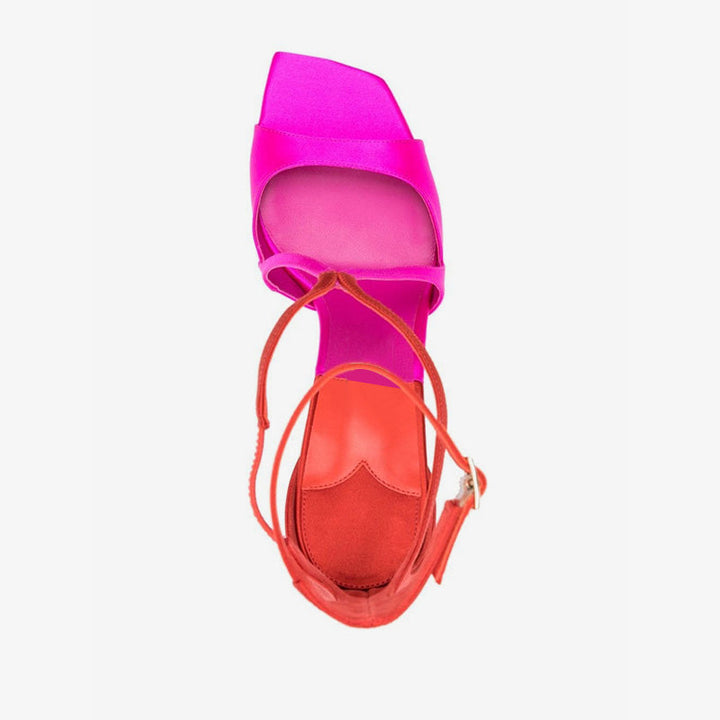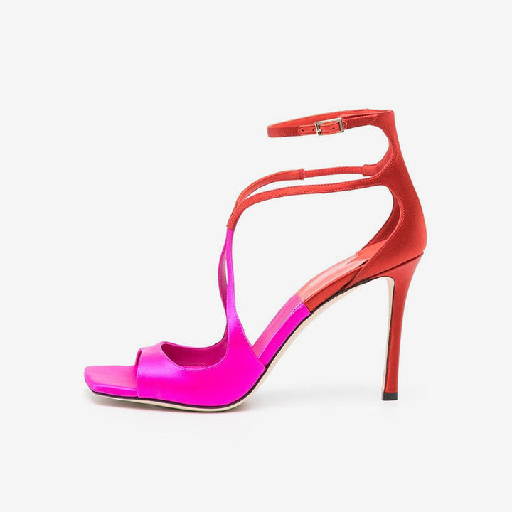 These satin sandals showcase a bold pink and red colour-block design with signature curved multi-way straps. Featuring a square open toe, slim 95mm stiletto heel, and a buckle-fastening ankle strap, they're finished with leather lining and a calf leather sole for a polished, modern look.Color:pink and red