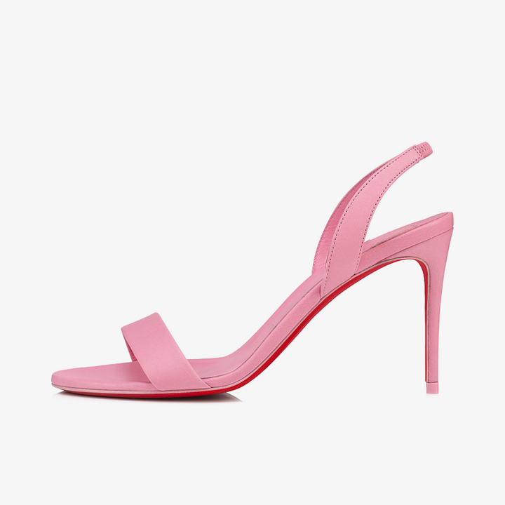 The pink sandal is designed to turn heads, with its smooth curve of the 80 mm heel tapering into the vibrant red sole for a striking contrast. Crafted from soft calf leather, the sleek arch, almond-shaped toe, and delicate ankle strap elevate this model, making it a perfect blend of simplicity and sophistication.
