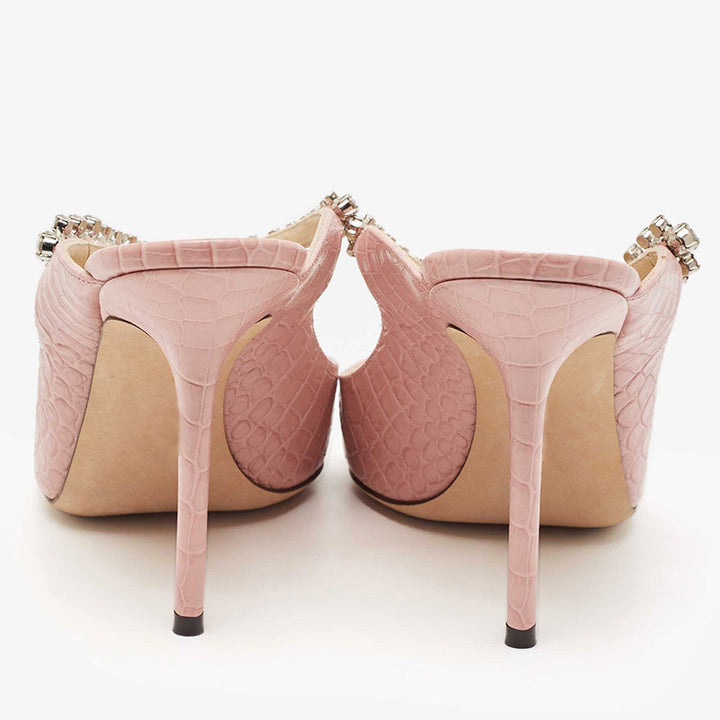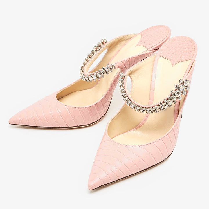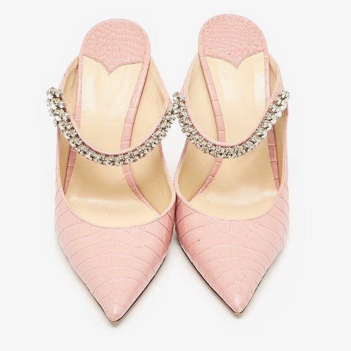 Elegant slip-on mules in pink croc-embossed leather, featuring a pointed toe, crystal-embellished strap, and smooth leather lining, insole, and sole for a refined look.