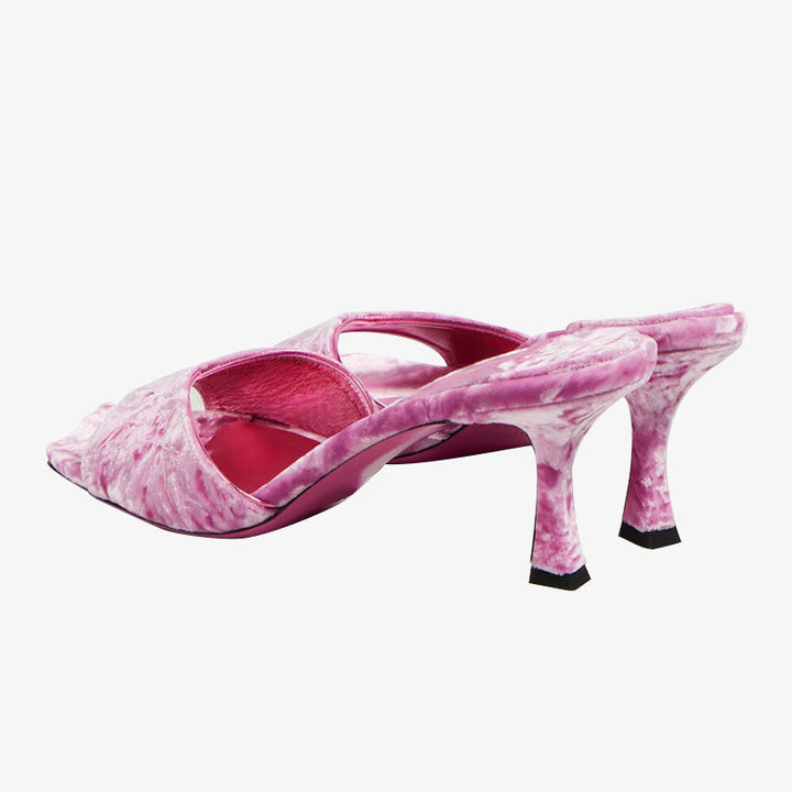 Crafted from plush crushed velvet, these pink mules feature a square open toe, slip-on design, and sculpted 70mm heel. Finished with a leather outsole and lining, they offer a luxe take on a modern silhouette.