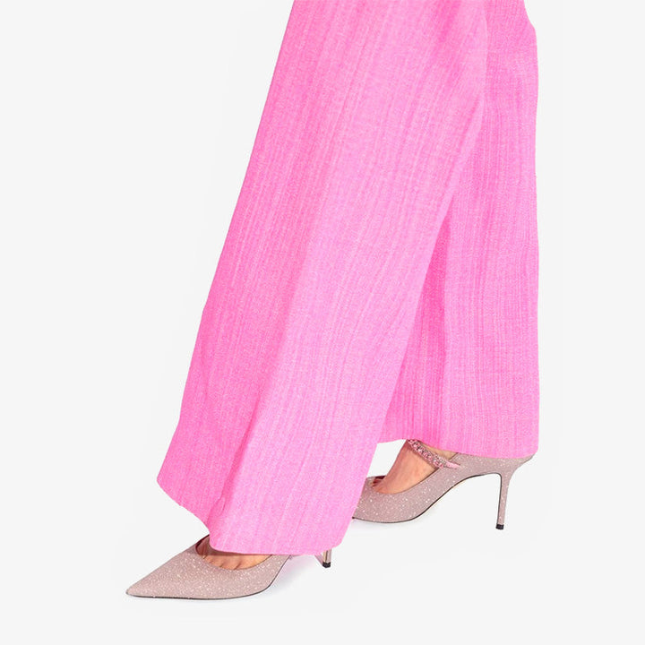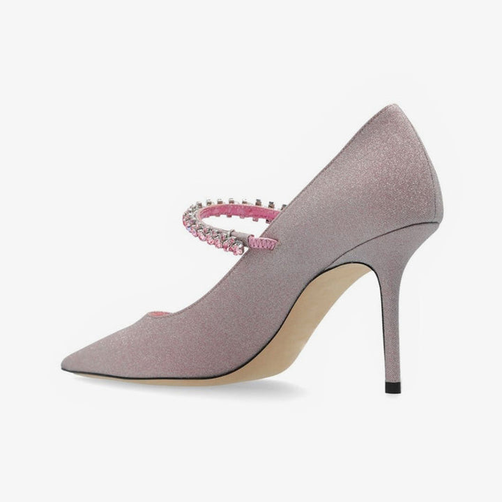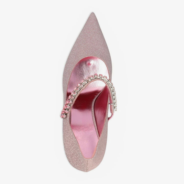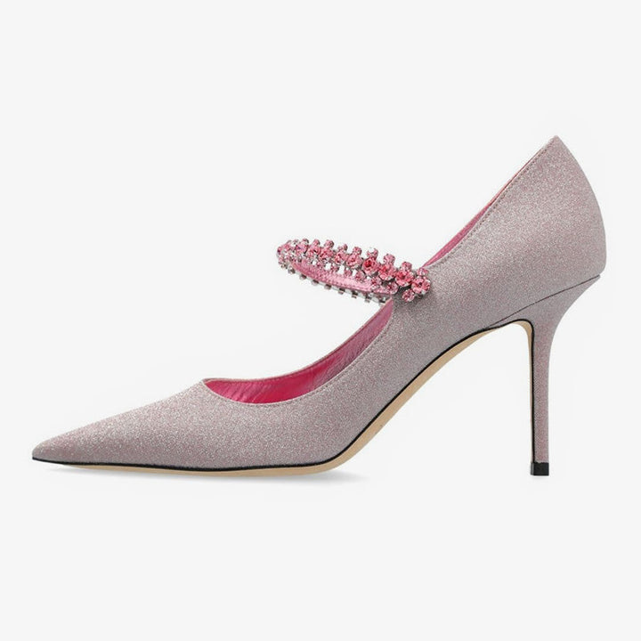 These pink pumps feature a pointed toe with sparkling crystal embellishments. Crafted from glitter fabric and leather, they offer a luxurious look with leather lining and sole for added comfort and style.