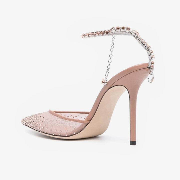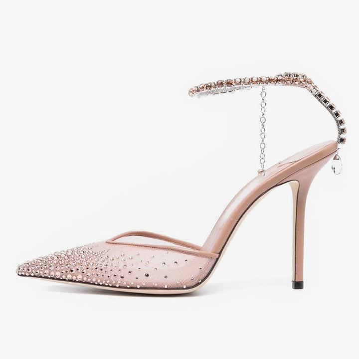 Crafted from pink tulle, these pumps are adorned with crystals from the pointed toe to the ankle strap. A delicate crystal chain drapes at the heel, ending in a pear-shaped stone. Finished with a high 100mm stiletto heel and leather sole, they blend elegance with eye-catching sparkle.Color: pink