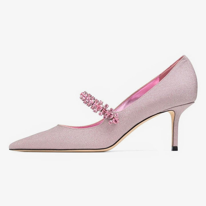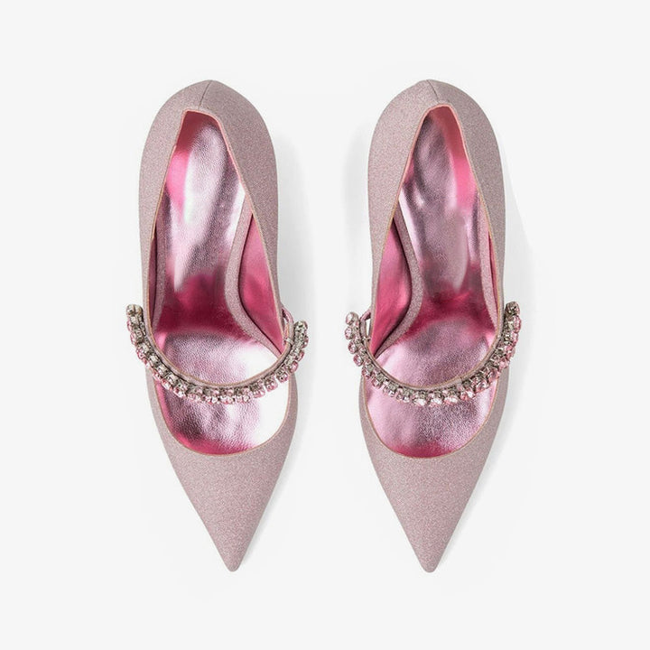 These 65mm pumps feature pink glitter detailing, crystal embellishments, and a pointed toe. Designed with a single toe strap, contrast lining, and a mid-tapered heel, they offer a chic slip-on style with a leather sole for a polished finish.Color:pink