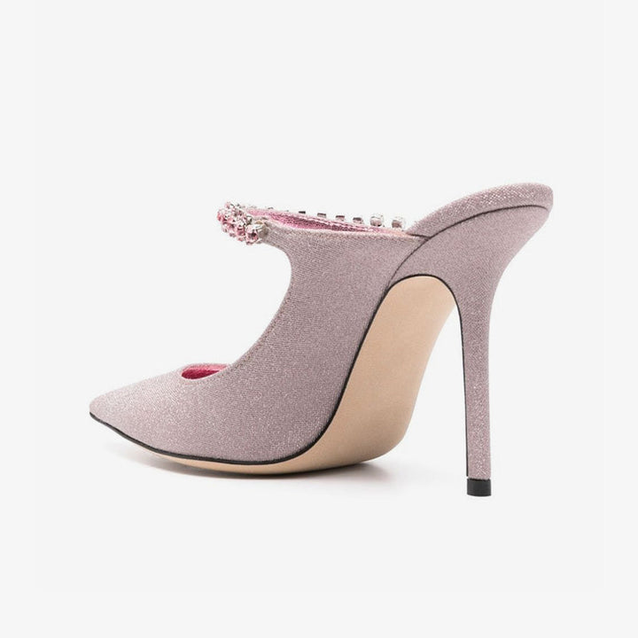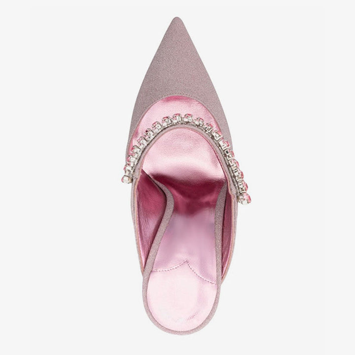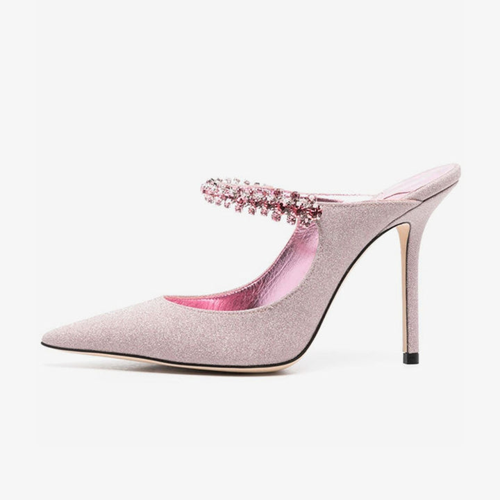 Radiate glamour in these pink mules, featuring sparkling glitter fabric, a crystal-embellished strap, and a pointed toe. Designed with a slip-on silhouette, leather lining and sole, and a sleek 100mm stiletto heel for a bold finish.