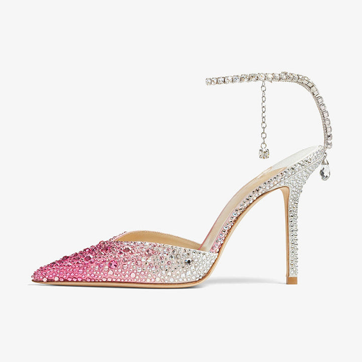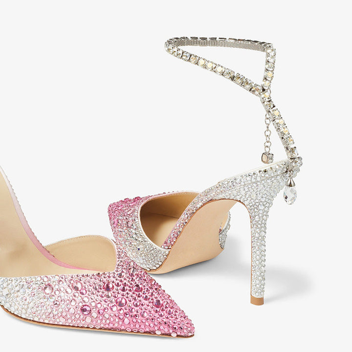Crafted in satin with a pink-to-silver gradient finish, these pumps are adorned with 40 hand-applied crystals and feature a delicate crystal anklet that drapes elegantly at the back. Designed with a pointed toe and set on a 100mm stiletto heel, they deliver a bold, glamorous silhouette perfect for special occasions.
