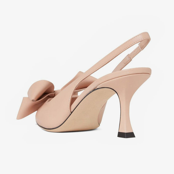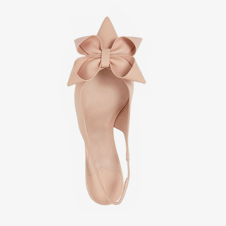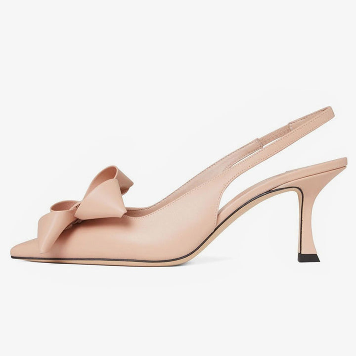These pink pumps feature a pointed toe, sculpted mid heel, and an elegant bow detail. Crafted entirely from calf leather, they include an elasticated slingback strap for a secure and comfortable fit. Heel height: 70mm.