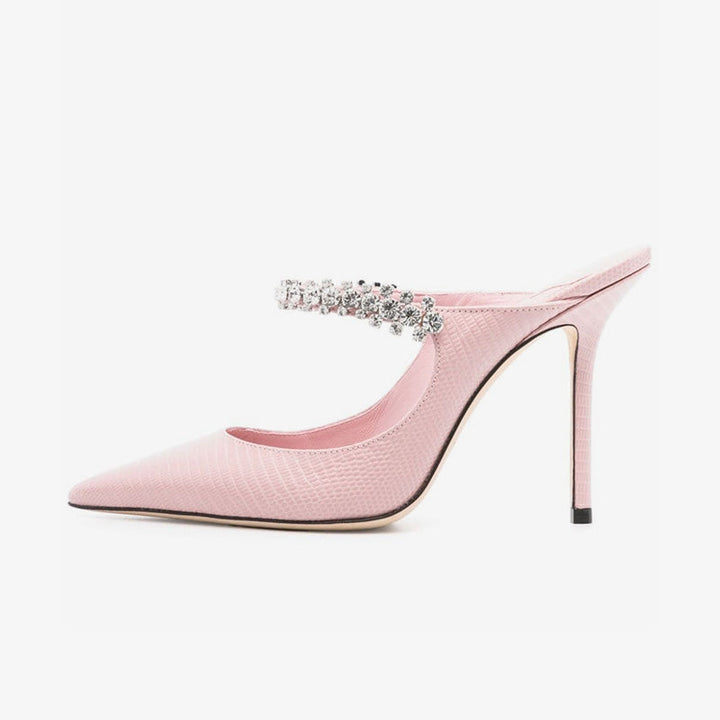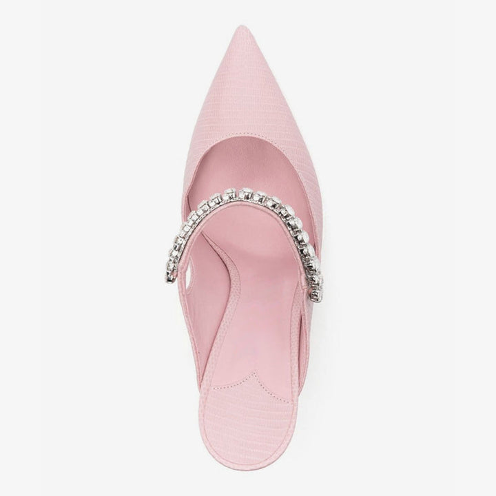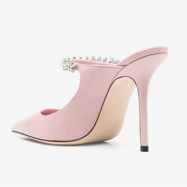 Sophisticated and striking, these pink pumps feature a lizard-textured leather finish, pointed toe, and a crystal-embellished crossover strap. Finished with a leather sole and a 100mm stiletto heel for a bold, refined look.