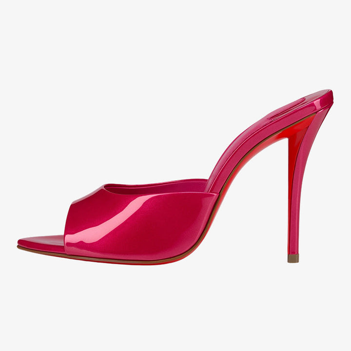 This elegant mule features a tapered silhouette in glossy fuchsia patent calf leather, a slim toe-revealing band, a padded insole, and a stiletto heel. Finished with a durable signature red sole that stays vibrant wear after wear.