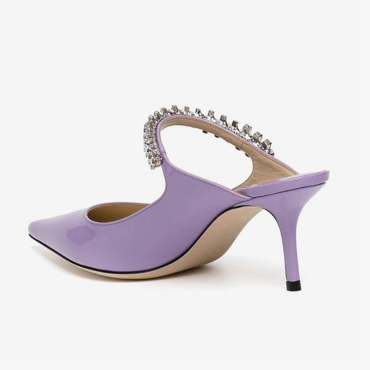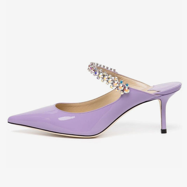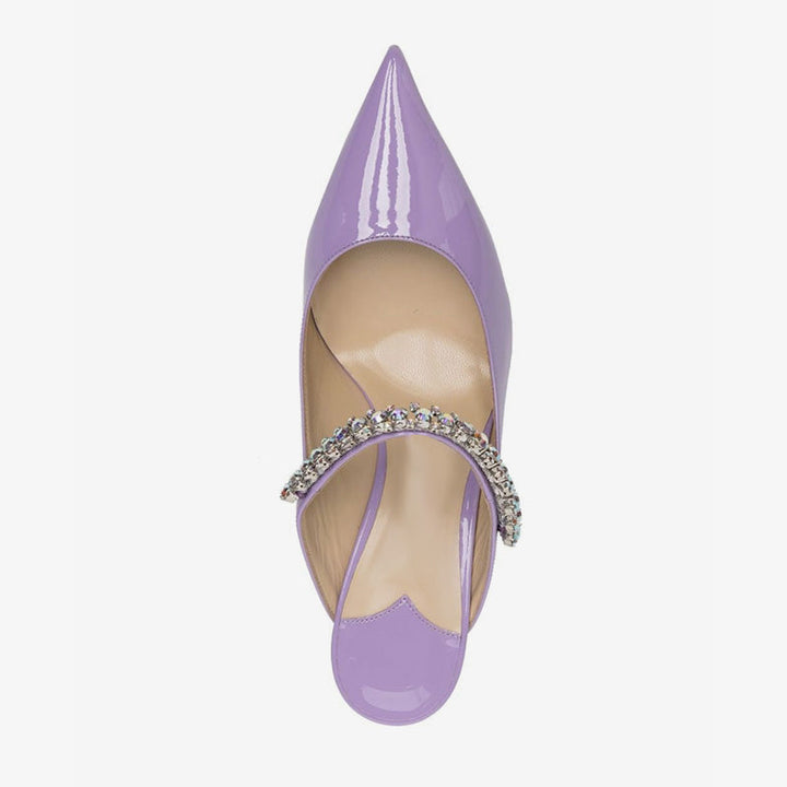 Sleek and striking, these purple mules feature a glossy patent finish, pointed toe, and a rhinestone-embellished strap. Designed in a slip-on style with leather lining and a 65mm stiletto heel for a polished, elegant look.