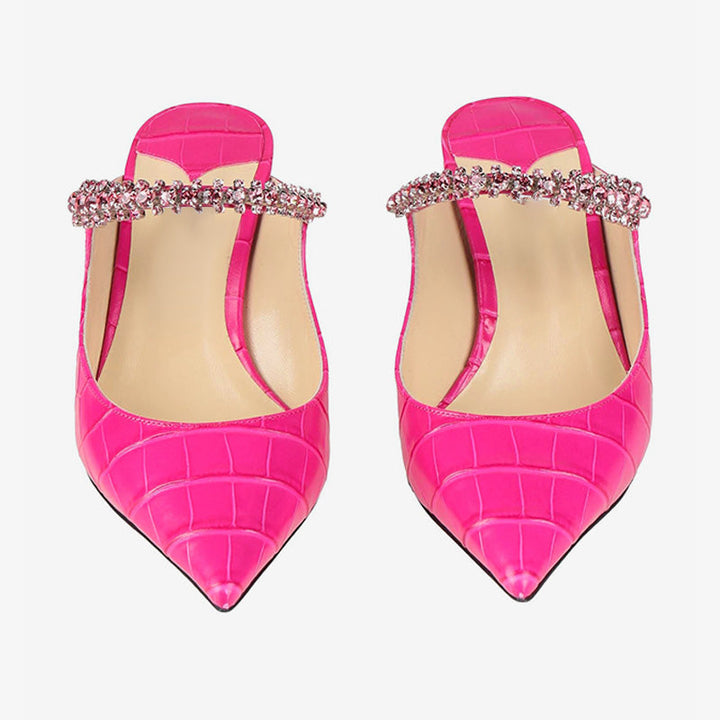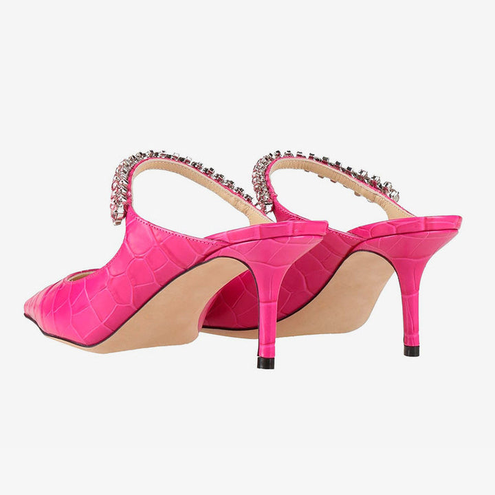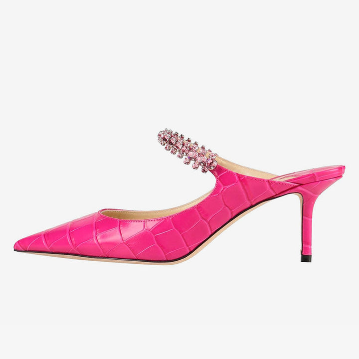 Refined and bold, these leather mules feature a crocodile-print finish, pointed toe, and decorative appliqués. Designed with a covered spike heel, leather lining and sole, and an 65mm heel height for a sleek, elevated look.
