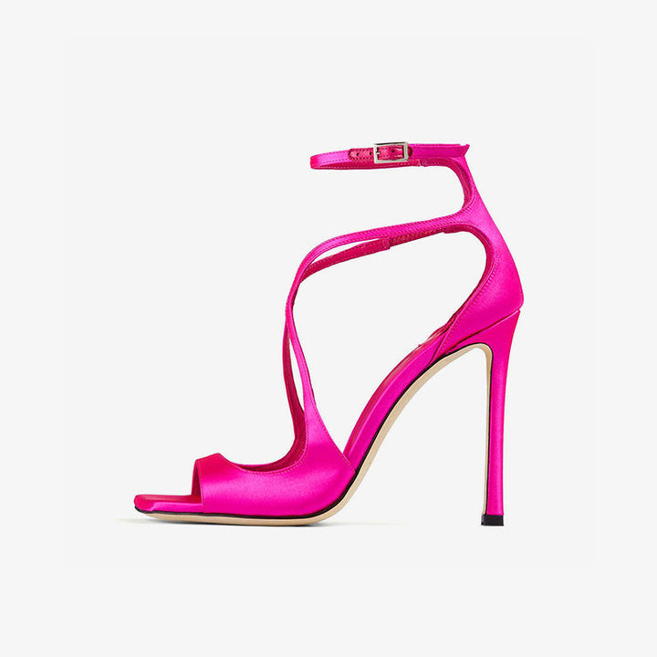 These striking red satin sandals feature delicate curved straps that elegantly wrap up your feet, offering a flattering silhouette. With a slim 110mm heel, square open toe, and buckle-fastening ankle strap, they are the perfect balance of bold and sophisticated. Fits true to size.