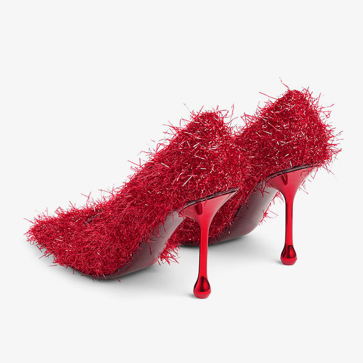 These striking pumps elevate the classic design with a contemporary drop heel and a square-cut vamp. Crafted from shimmering tinsel and featuring a pointed toe, they add a glamorous touch to your evening wardrobe, perfect for making a statement at any special event.The heel height of this pair is 80mm.