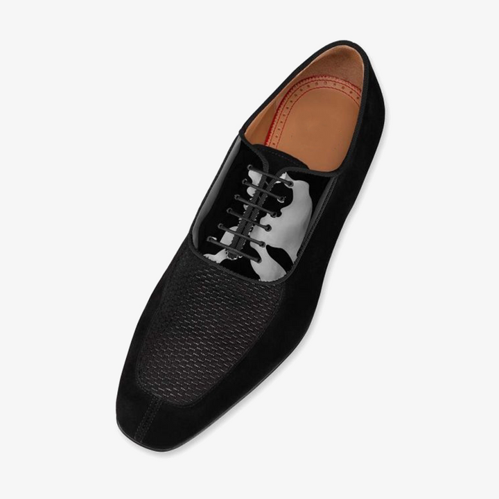 A refined Oxford shoe with rounded quarters, inspired by the low-cut waistcoat of a traditional three-piece suit. This model exudes retro elegance and is designed to suit slimmer feet and insteps. Crafted in all-over black, it combines textured Jacquard Evening fabric with glossy Patent Leather, accented with a tonal Grosgrain ribbon trim for a sophisticated touch.Upper: 100% patent calf leather , suede and fabric