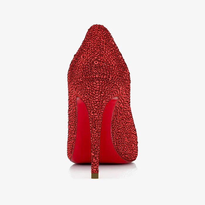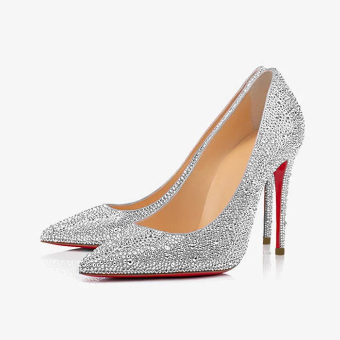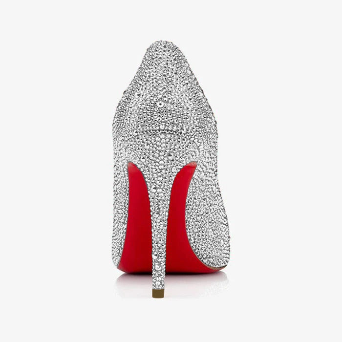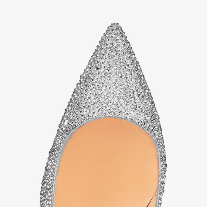 This dazzling stiletto features sleek, elegant lines and is fully adorned with sparkling rhinestones. With its slender 100mm heel and modern pointy toe, it strikes the perfect balance between contemporary flair and timeless elegance. The upper and heel are covered in metallic strass, catching the light in a stunning array of sizes, making this a bold statement piece for any wardrobe.