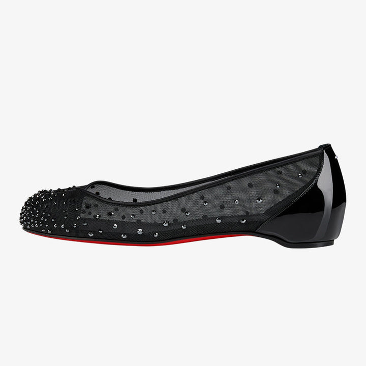 This tapered black flat combines transparent mesh and sleek calfskin, highlighted by a split-toe silhouette and a bold crew neckline. Gradient rhinestones add elegant sparkle, while the signature red sole stays vibrant thanks to an innovative coating.