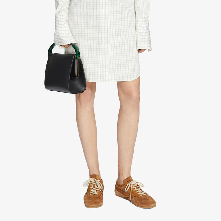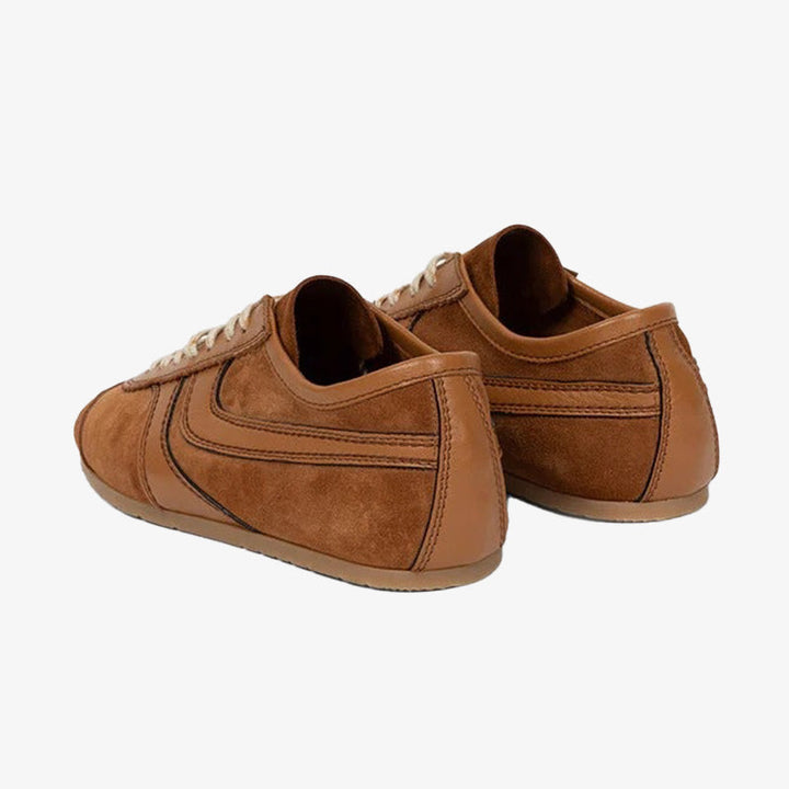 These brown suede sneakers offer a timeless blend of sophistication and sporty charm. Smooth leather accents enhance the texture, while the thin rubber sole provides a comfortable and flexible fit. A versatile choice for effortless everyday style with a vintage touch.