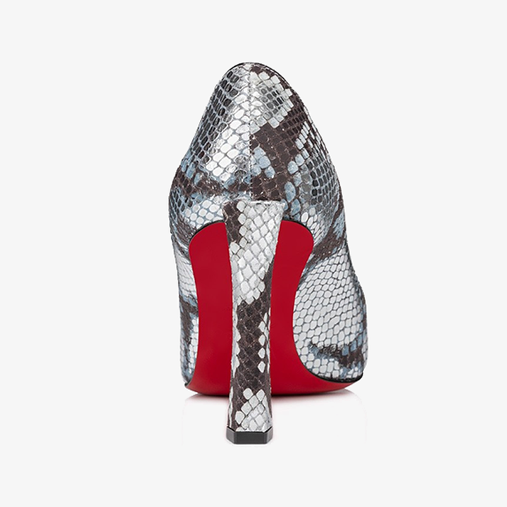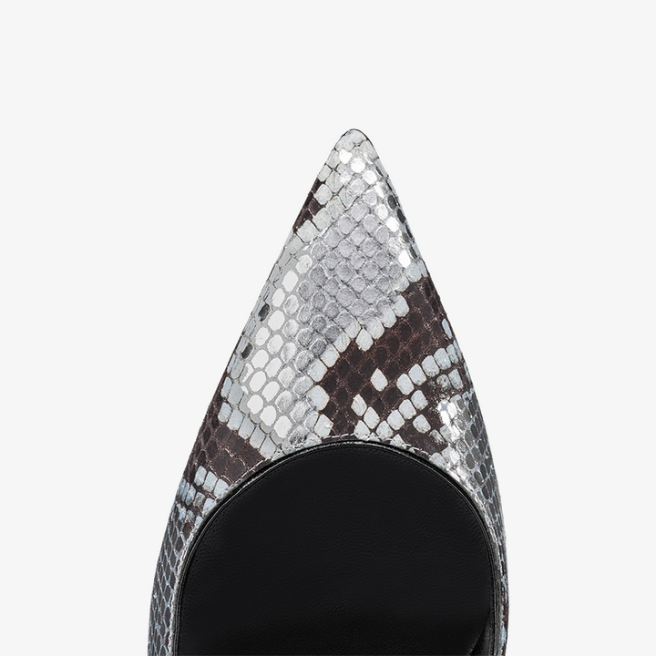 This elegant pump is crafted from silver embossed snake-effect leather, featuring a sleek pointed toe and a daring low-cut vamp that elegantly reveals the foot. The 80mm slanted heel adds a modern edge, while the clean lines and graphic design enhance its timeless sophistication.